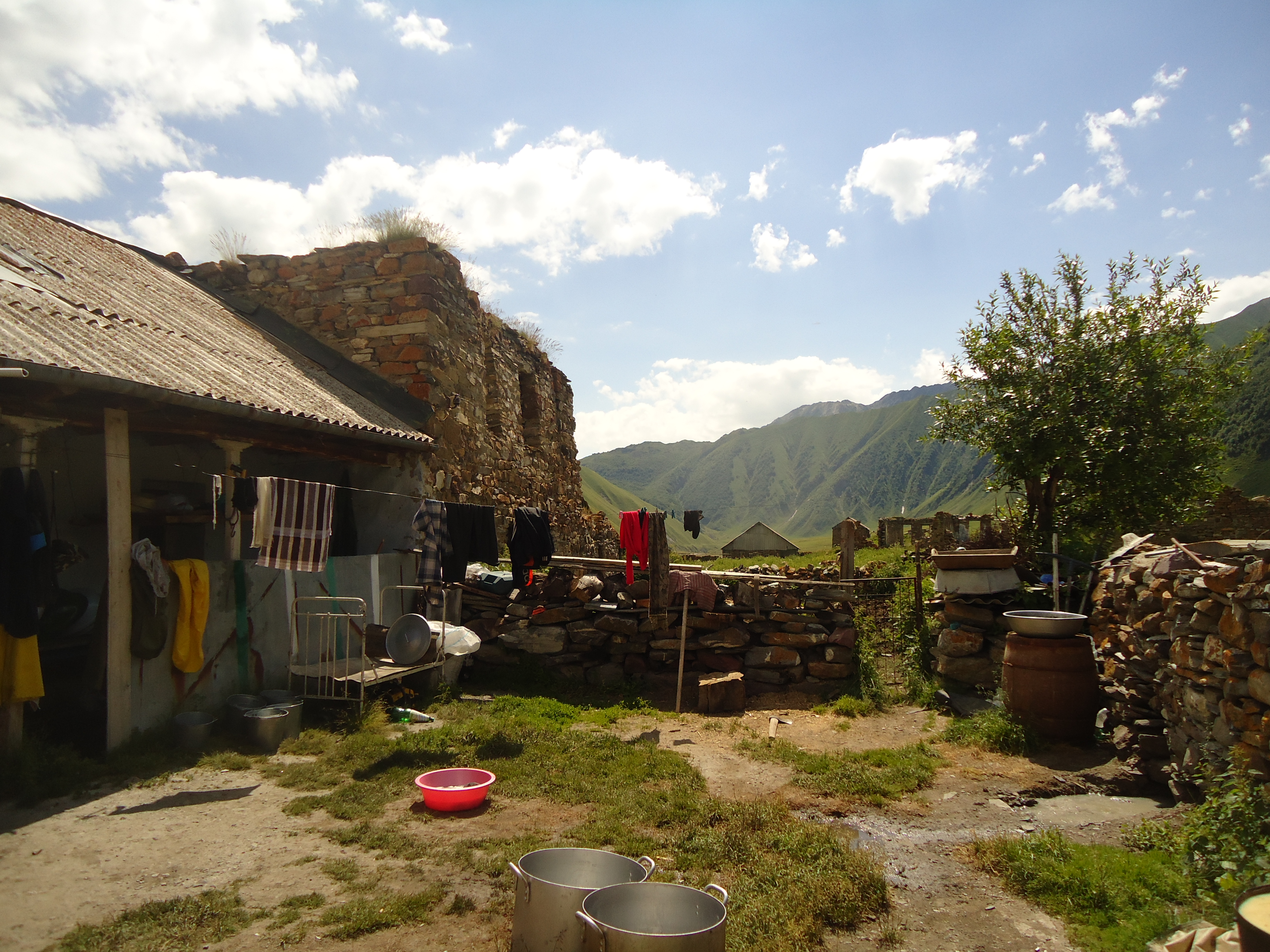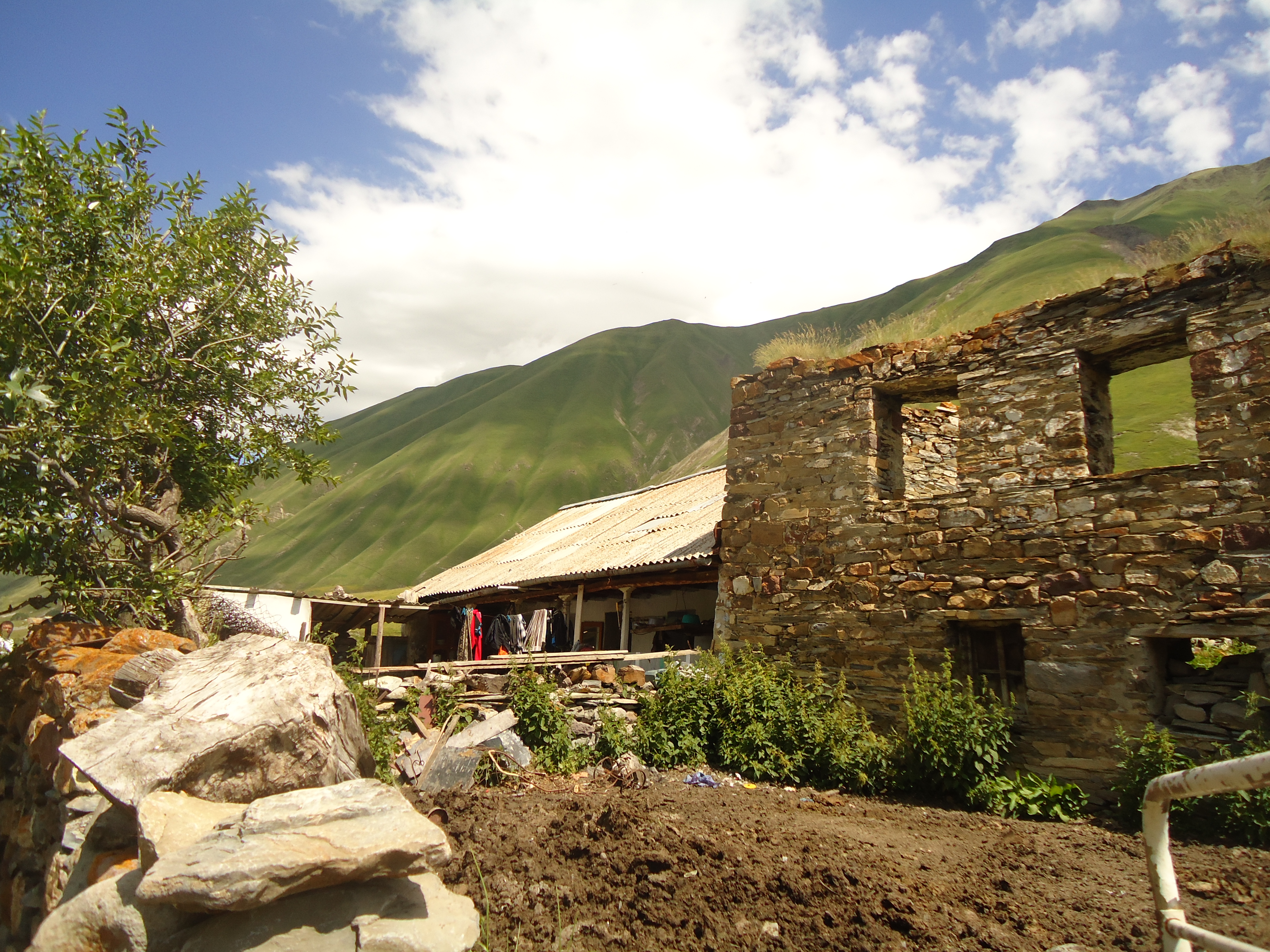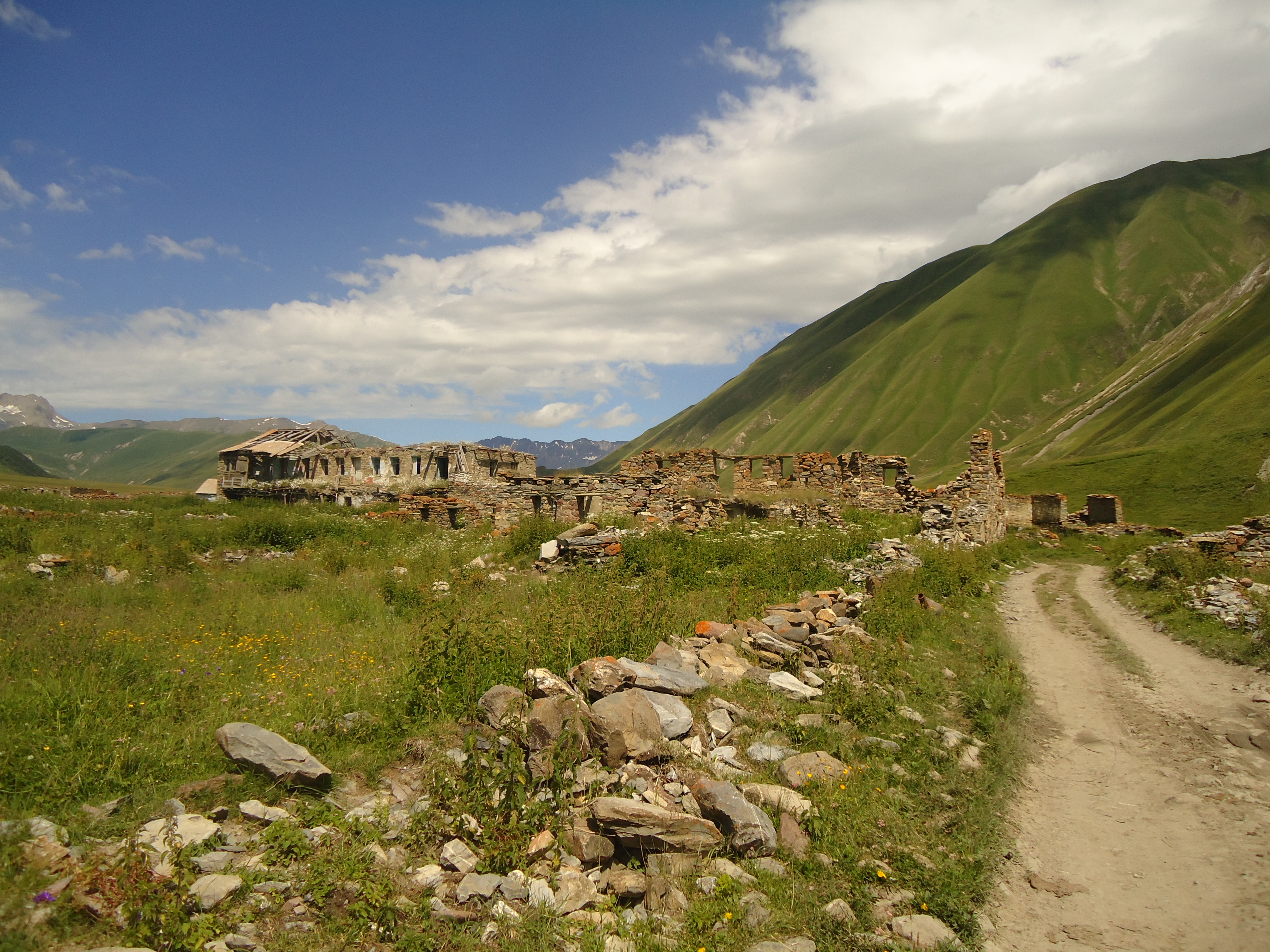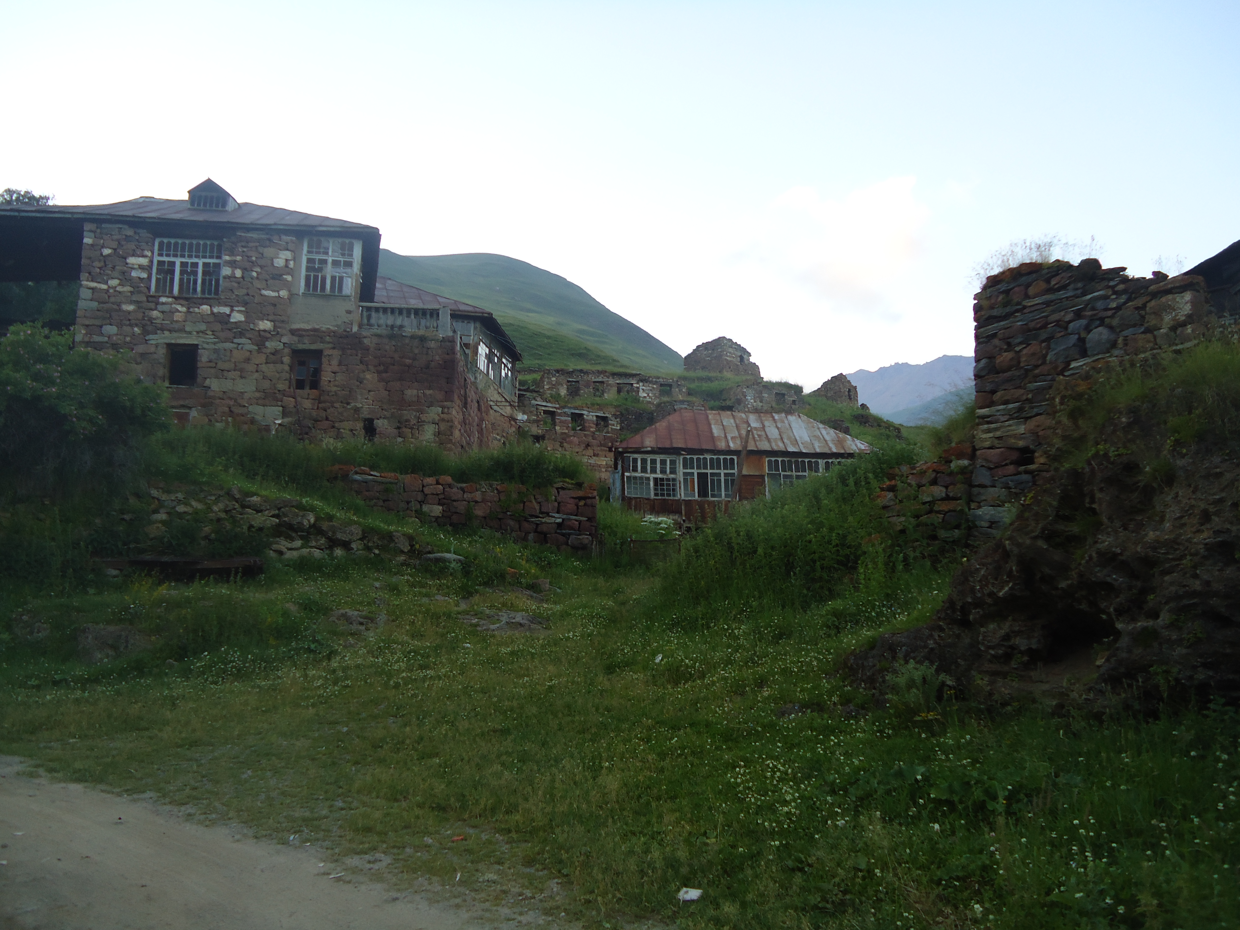 There were 12 villages in the gorge, though today they are abandoned. The road goes along the river Tergi. The first village is Nogkhau.Nogkhau is an Ossetian word and means “new village” in Georgian. Today only ruins are left in the Village, no inhabitants any more, though early in 90s about 20 families lived there. You can see a small shrine there.